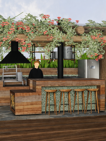 Para acolher os usuários da casa, uma área gourmet foi pensada para complementar a área de piscina e fire pit, pensando em um local com bancadas e forno a lenha com revestimento de terra, trazendo a organicidade e a fluidez do habitar praiano.